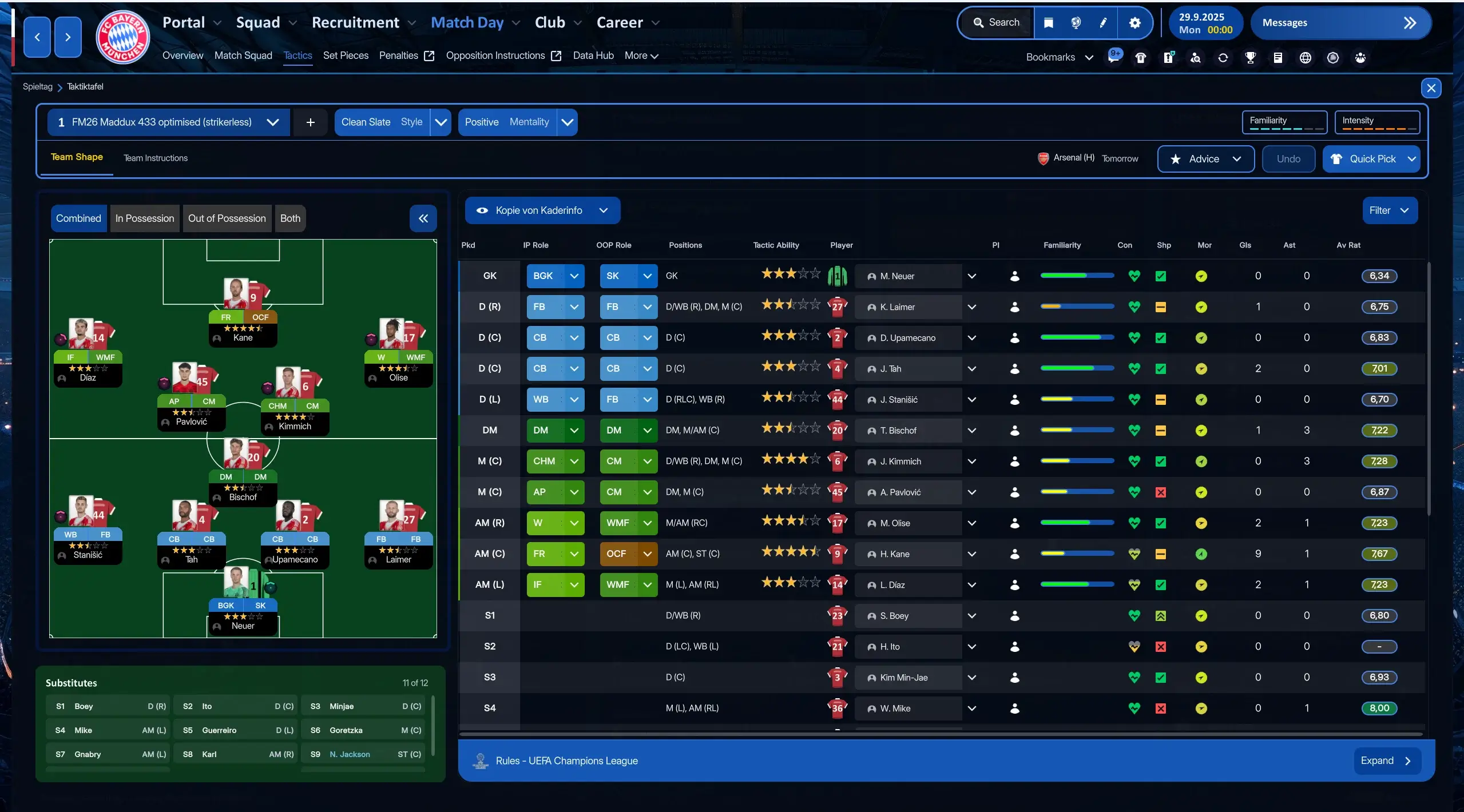 The semi-dark interface of this popular FM26 skin perfectly highlights the distinctive DF11 player face style, making player portraits look even sharper and more realistic.